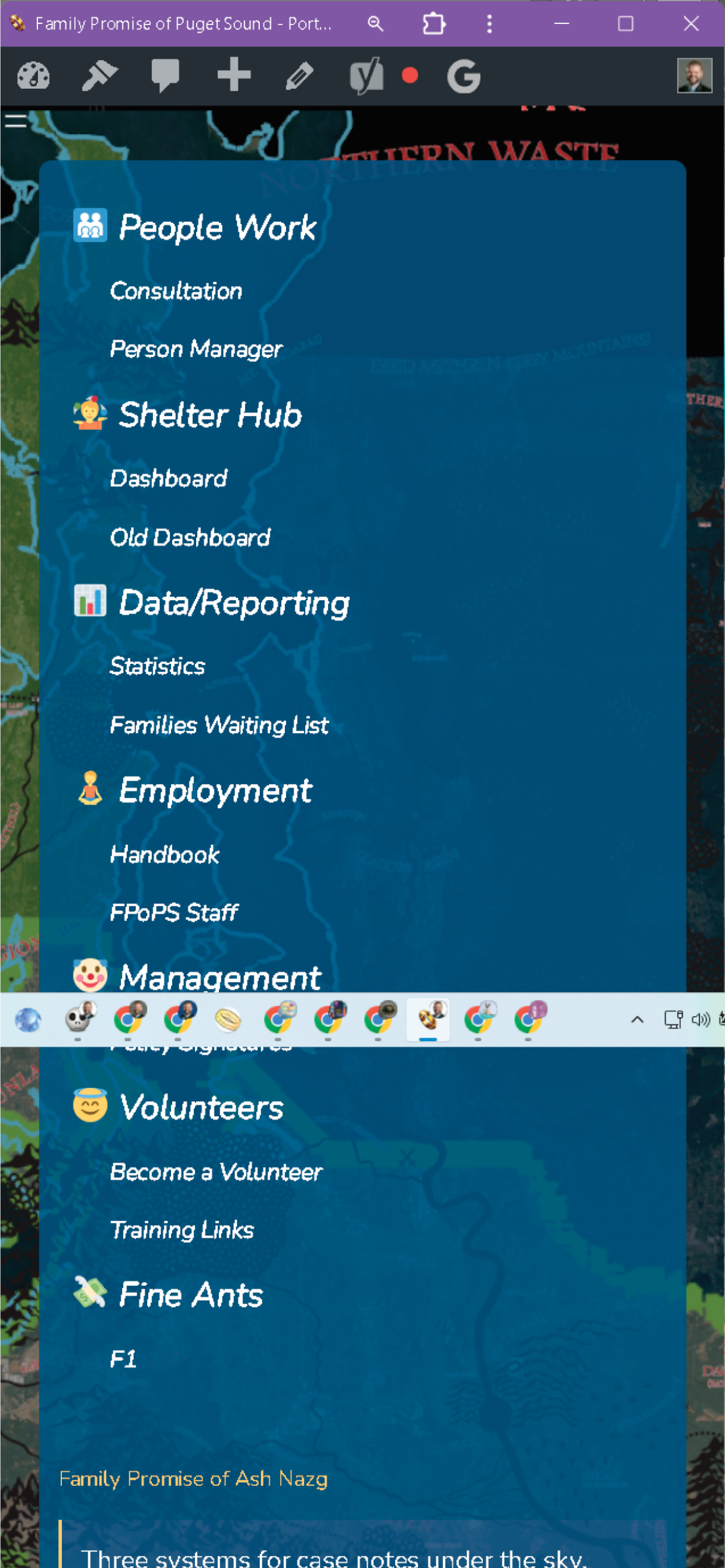 The FPOPS REPORTING page serves as a centralized hub for the internal Ash Nazg Portal, providing Family Promise of Puget Sound staff with quick access to all key case management, financial (Fine Ants), communication, and administrative tools and records.